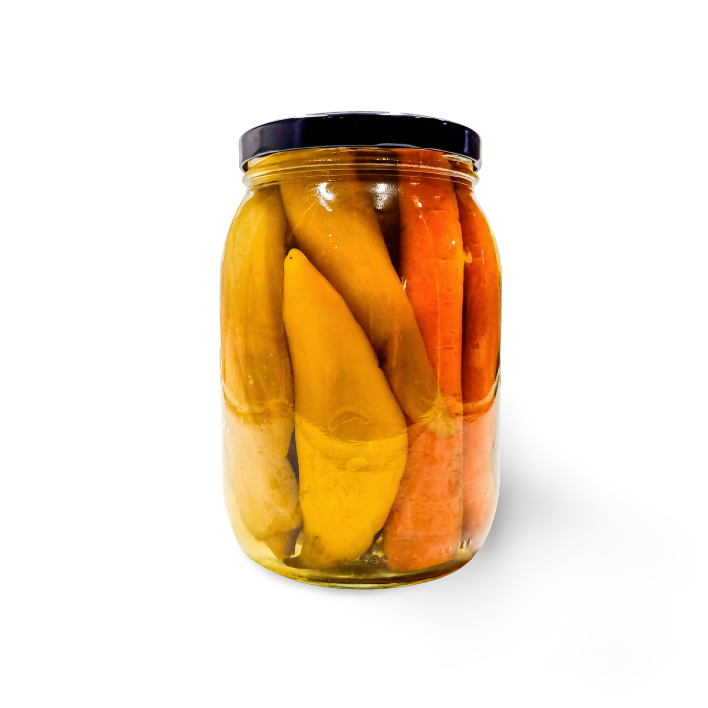 A vibrant mix of pickled vegetables in traditional Macedonian style, combining gherkins, green tomatoes, carrots, banana peppers, and cabbage in a tangy brine. Perfect as a side dish, sampler for tastings, with diverse textures and flavours.